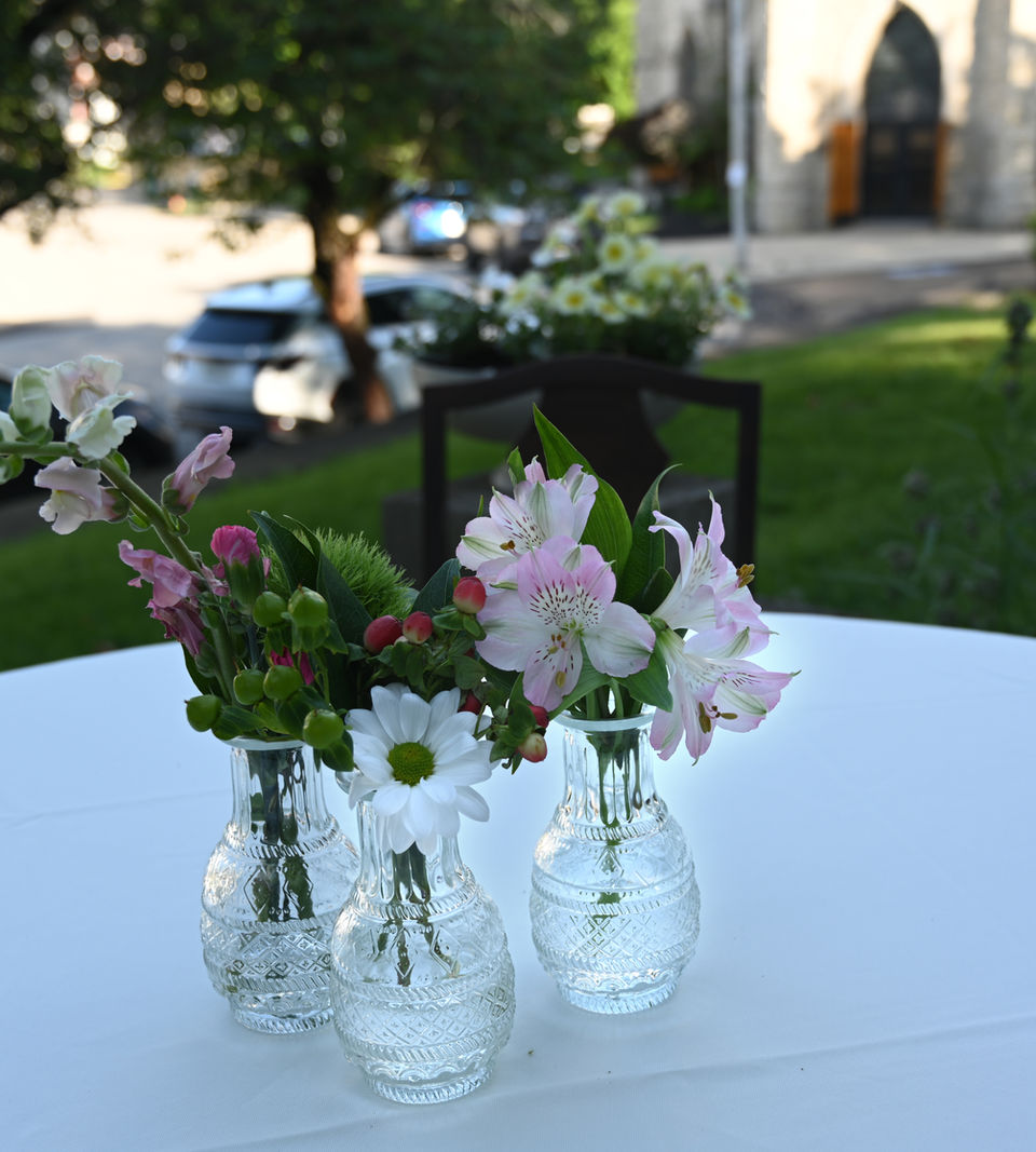 Hosting Kaitlyn and Ryan's wedding reception was a dream come true! Kaitlyn's vision of florals and greens gracing every possible surface created a fresh, airy feel that matched the warm summer day. Guests enjoyed each other with elegant finger-food offerings and conversation groupings inside while tables and a charming snow-cone cart offered a refreshing option outside.